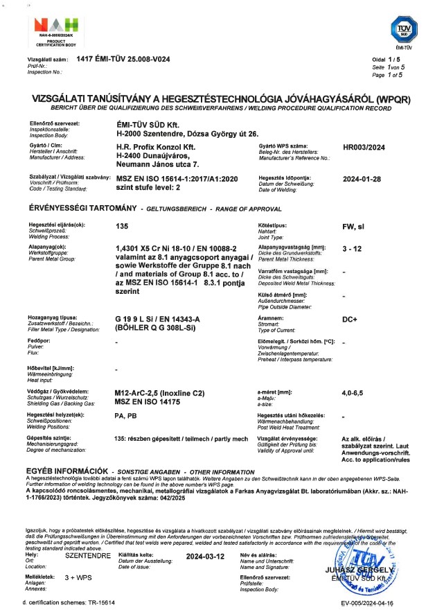 ÉMI-TÜV Hegesztés- technológiai Tanúsítvány II. WPQR